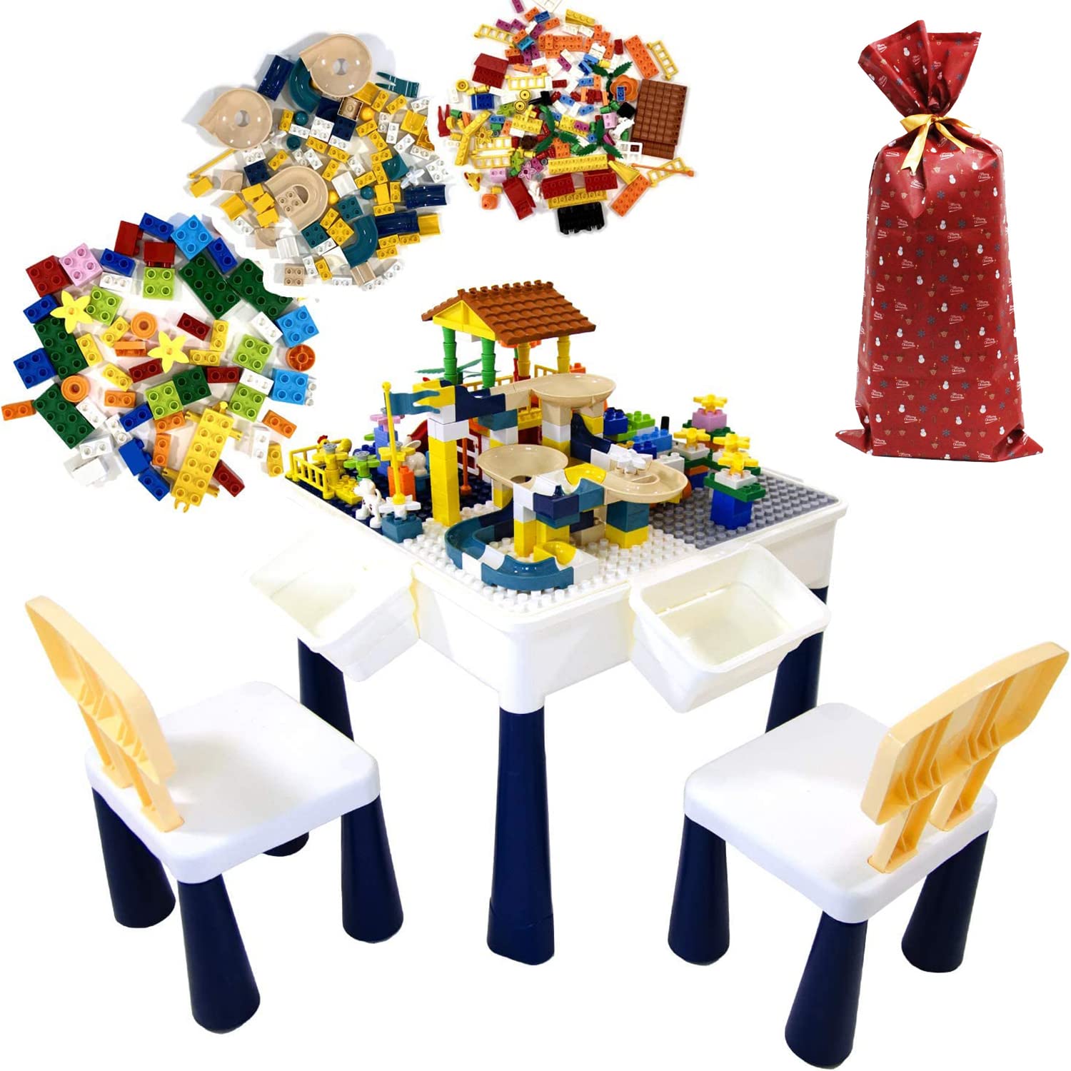 [MRG] ブロックテーブル 293ピース 多機能デスク セット 椅子2脚付き 知育玩具 収納付き お絵描き 水遊び 砂遊び 高さ調整 子供用テーブル キッズデスク (ブルーベージュ系 04.1set(ラッピングクリスマス))