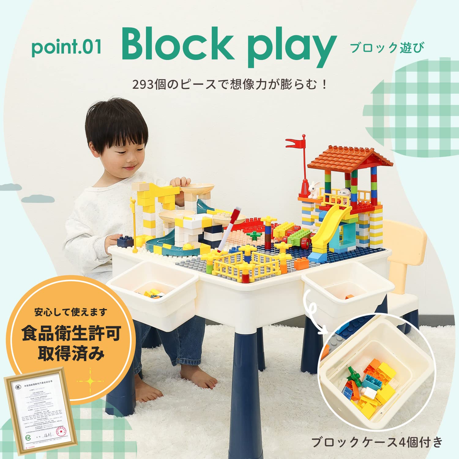 【おすすめポイント】LEGO デュプロ と互換なのでお手持ちのブロックも使用可能。マルチに使えるデスクと椅子2脚付き!付属のブロック、ボリュームたっぷり、293ピース。食品衛生許可取得済みですので、安心してご使用いただけます。テーブル部分の天板を開いて、そのままお片付けできます。ブロックの収納も可能!天板を裏返せば、お絵描きできます。天板を裏返してお子さまのテーブルとしても使えます!天板を外して中に水や砂を入れれば、水遊び・砂遊びが可能!底に栓が付いているので片付けやお手入れも簡単です。机の高さは、付属のパーツ追加で7cmアップ可能!取付けも簡単なので、成長に合わせて高さを調節できます。