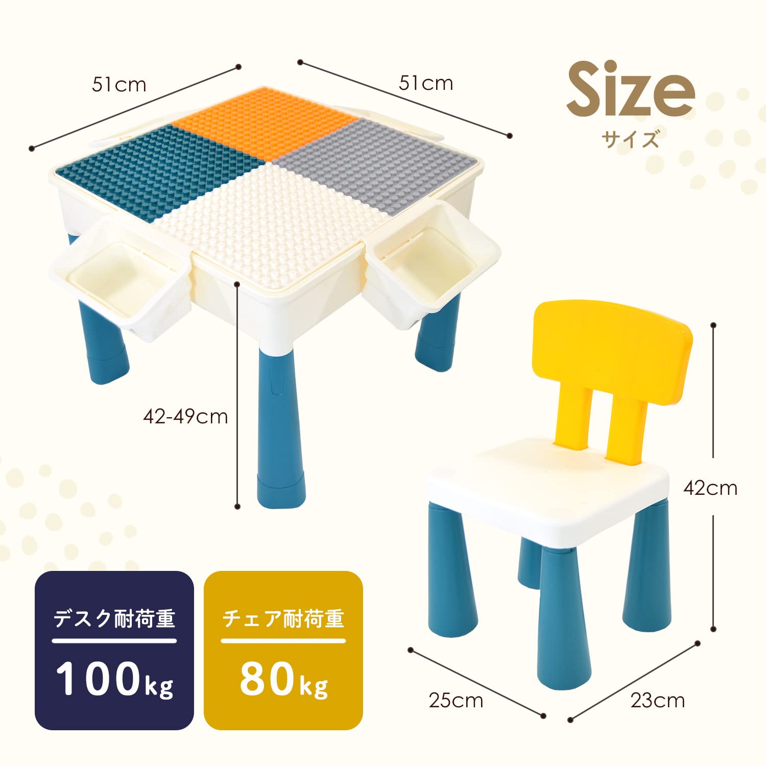 サイズ:テーブル:51×51×43-49cm/椅子:25×23×42cm