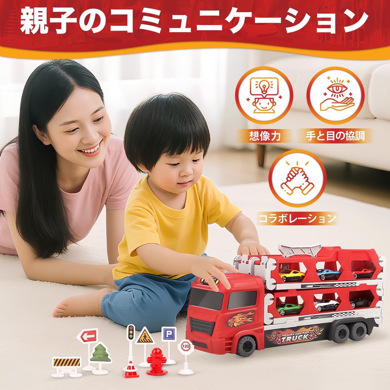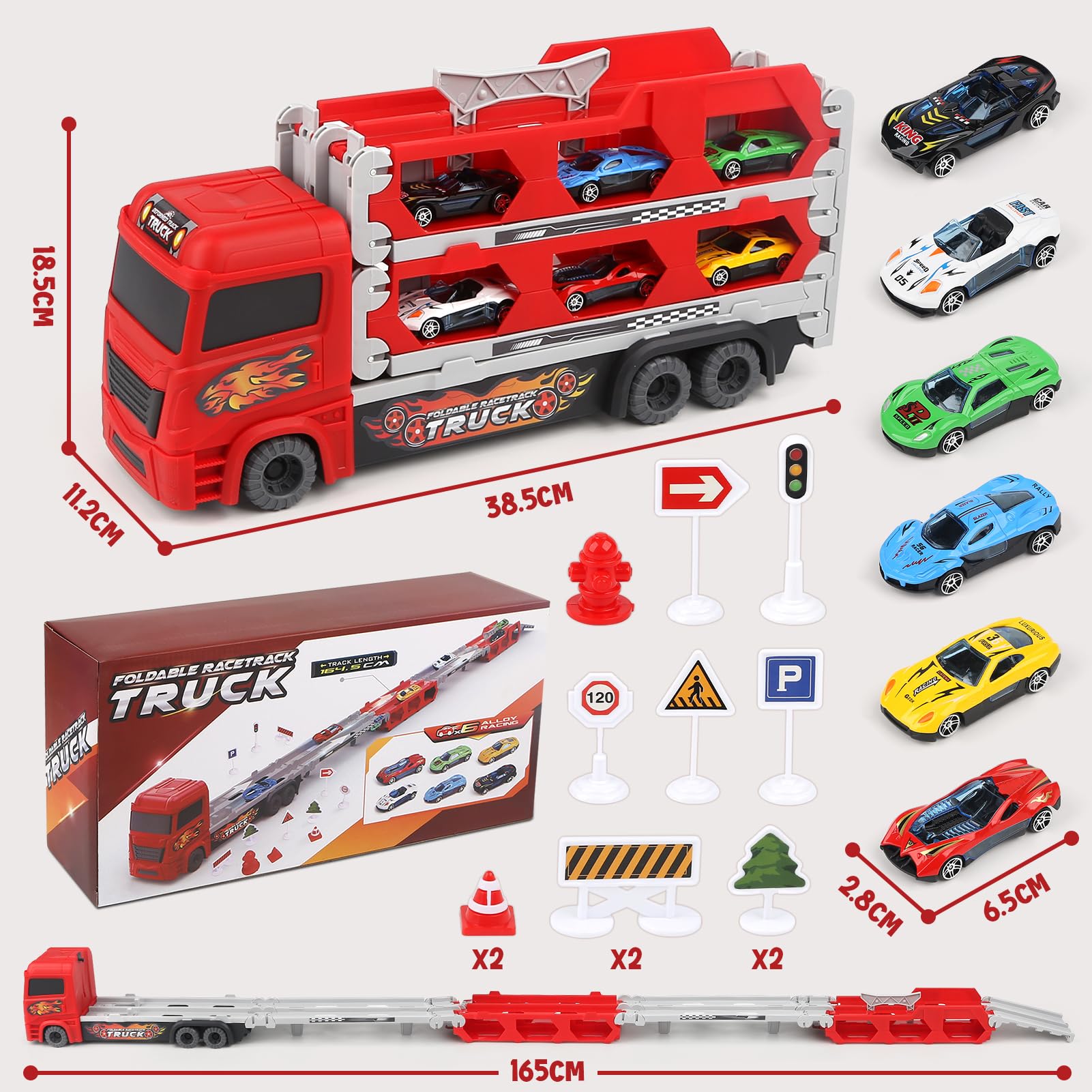 ??【22PCSおもちゃの車セット】 - 大型おもちゃのトラック1台、合金製メタルミニカー 6個、カスタムステッカー3枚、道路標識アクセサリー12個が含まれています。子供 の 車 おもちゃ には、丈夫で落下に強いABSプラスチック素材で作られた6つの車輪も装備されています。
