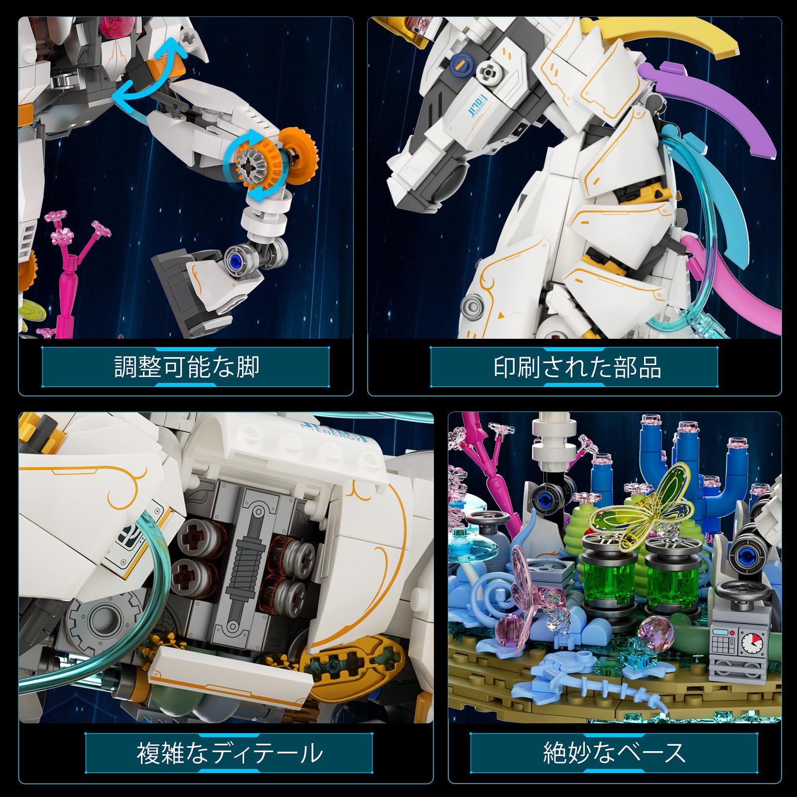 【夢のようなレインボーユニコーン】魔法、純粋さ、そして希望を象徴する神話上の生き物からインスピレーションを得た、精巧にデザインされたレインボーユニコーンは、豊かなディテールを誇ります。脚は調節可能なので、生き生きとしたポーズを簡単に作ることができます。美しく精巧に作られた植物の台座は、遊び心とメカニクスを融合させ、ユニコーンのディスプレイに詩的な雰囲気を添えるユニークなブレンドを生み出しています。