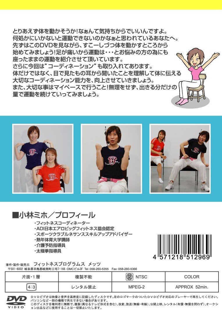 とりあえず体を動かそうか!なぁんて気持ちからでいいですよ。何処かに行かないと運動できないのかなぁと思われているあなたへ。先ずはこのDVDを見ながら、すこーしづつ体を動かすところから始めてみましょう!足が痛いから運動は・・・とお悩みの方の為にも、このDVDは椅子に座ったままの運動を紹介させて頂いています。さらに今回は“コーディネーション”も取り入れてあります。体だけではなく、目で見たもの耳から聞いたことを理解して体に伝える大切なコーディネーション能力を、向上させていきましょう。また、大切な事はマイペースで行うこと!無理をせず、出来る分だけの量で運動を続けていってみましょう。 ※ 指導者の方へ。このDVDをグループエクササイズにも活用してみてください。日常で行われている運動を、軽快な音楽に合わせて展開しています。どなたにでも指導が可能と思われますので、参考にしてみてください。