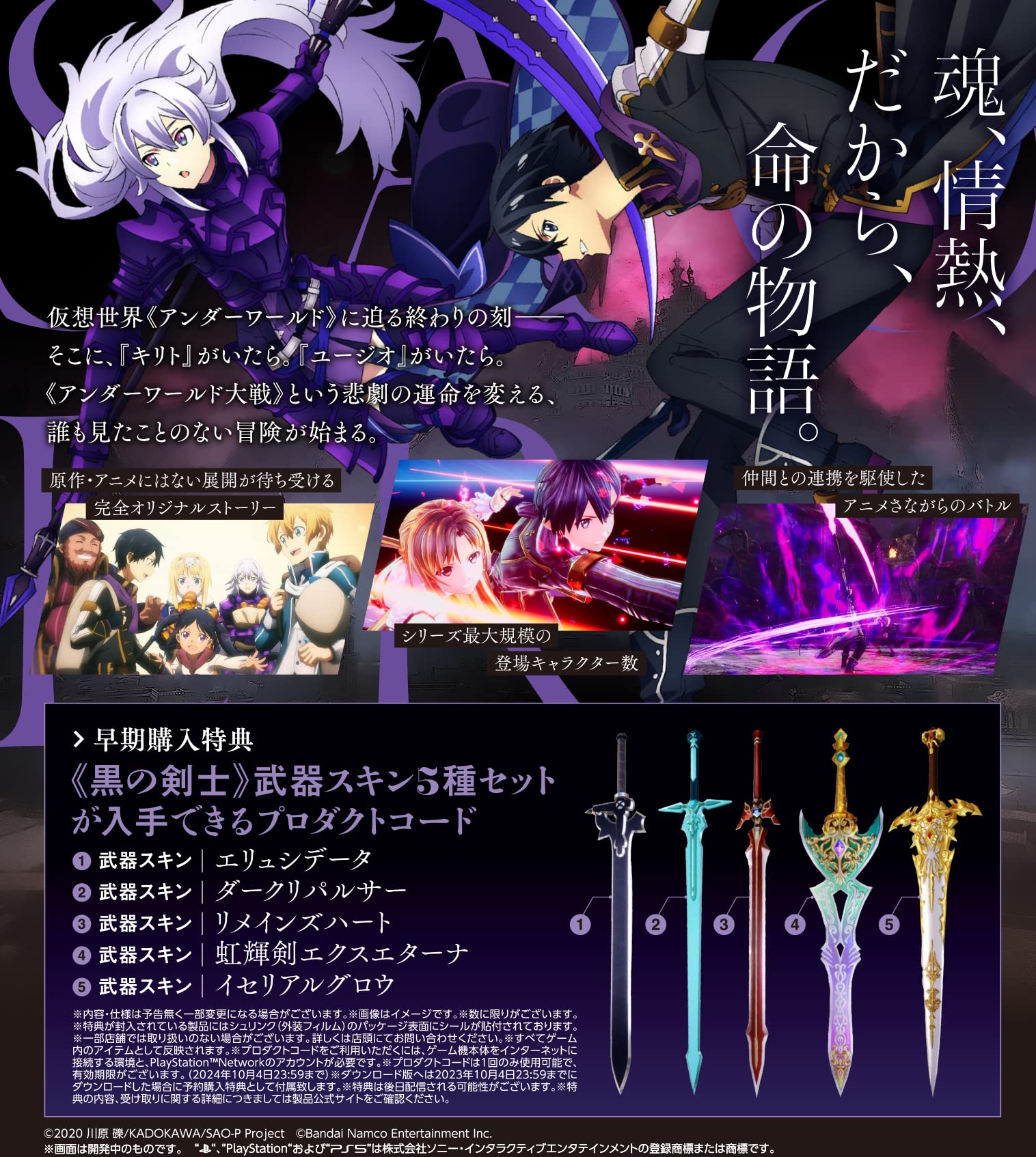 魂、情熱、だから、命の物語。 過去最多のキャラクターとシナリオ数で贈る『ソードアート・オンライン』ゲームシリーズの集大成となるRPGが遂に登場! 終わりの時が迫る仮想世界《アンダーワールド》を舞台に、原作・アニメをベースとしたオリジナルストーリーが展開。 2つの世界の最終戦争が始まろうとしていた時、キリト達の前に謎の暗黒騎士の少女が現れる。 決して変えることのできない悲劇の運命の中に、「キリト」がいたら。「ユージオ」がいたら。誰も知らない命の物語が始まる。 MMOライクな遊びはそのままに、バトルは更にハイスピード&スタイリッシュに! 多彩な武器種での戦いと、個性的な仲間たちとの連携が楽しめる。